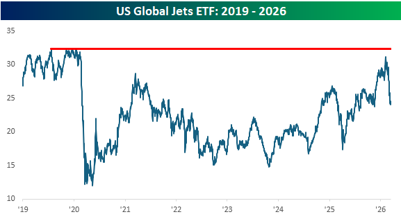 Looking at the airline stocks from a longer-term perspective, the timing of the Iran war couldn’t have been worse. At its recent peak in February, the JETS ETF traded above $31 and was within a dollar of its pre-Covid highs. It’s been a long slog for the sector, but after more than six years, it’s almost back to even.
