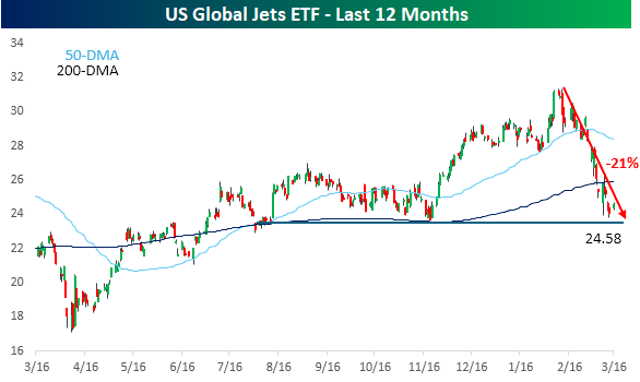 Can it get any worse for airline stocks? After already dealing with the government shutdown where TSA agents aren’t getting paid, the war with Iran has caused jet fuel prices to double and raised the threats of terrorism, which, at the margin, causes travel plans to decline. Since its peak in early February, the US Global Jets ETF (JETS) has plunged more than 20%, effectively erasing the gains from late last year after it broke out of a multi-month trading range. At $24.58, the ETF closed yesterday right near support at the low end of that prior range.