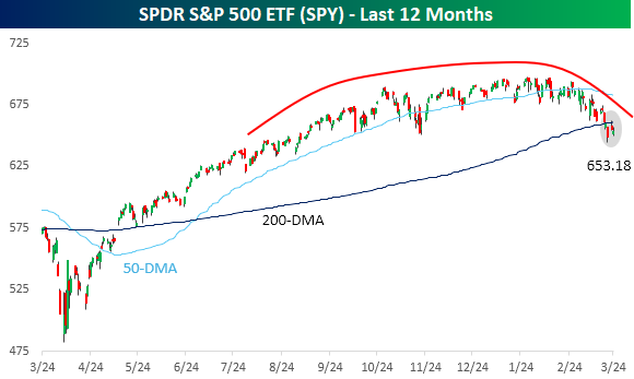 Second, with RSP still holding on to gains for the year, it has also stayed above its 200-DMA. The same can’t be said for the S&P 500, which broke that level last Thursday. For now, bulls can rationalize SPY’s break of the 200-DMA by pointing to RSP still hanging on to that level. If both indices break that long-term average, though, bulls will have one less arrow in their quiver.