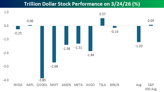 The S&P 500 finished down 0.37% yesterday, but most of the losses were focused in the trillion-dollar stock club, where the damage was much more concentrated. While the ‘average’ stock in the S&P 500 traded slightly higher yesterday, seven of the nine stocks in the trillion-dollar club traded lower, with an average of 1.2%. Stocks like Alphabet (GOOGL) and Microsoft (MSFT) were notably weak with declines of more than 2.5%, and both closed at multi-month lows. Other mega-caps like Broadcom (AVGO), Amazon.com (AMZN), and Meta Platforms (META) all fell more than 1%. The only mega-caps to buck the trillion-dollar market cap weight were Tesla (TSLA) and Apple (AAPL), which saw modest gains.