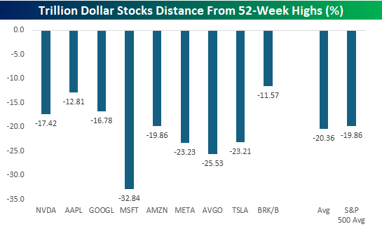 While the trillion-dollar stocks have been market leaders, they’re no longer the cool-kids table in the lunchroom. For months, they stood out above the rest of the market as the most popular in terms of where they were trading relative to 52-week highs, but now they no longer stand out. MSFT, AVGO, META, and TSLA are all down more than 20% from their respective 52-week highs, and the average drawdown from their peaks is just over 20%. That’s flirting with bear market territory and slightly more than the average 19.9% drawdown for all 500 stocks in the S&P 500.