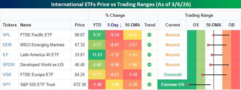 As bad as the US markets have been since the war broke out, it’s peanuts compared to the losses in the rest of the world. Below, we show the performance of various regional ETFs last week. While the S&P 500 was down nearly 2% last week, every other region of the world was down at least 6% and, in most cases, even more. Europe was down 6.6%, emerging markets were down over 8%, and stocks in the Asia Pacific region were down over 9%. As much as higher oil prices are a pain for US consumers and businesses outside of the Energy sector, other areas of the world are much more dependent on external sources for energy than the US.