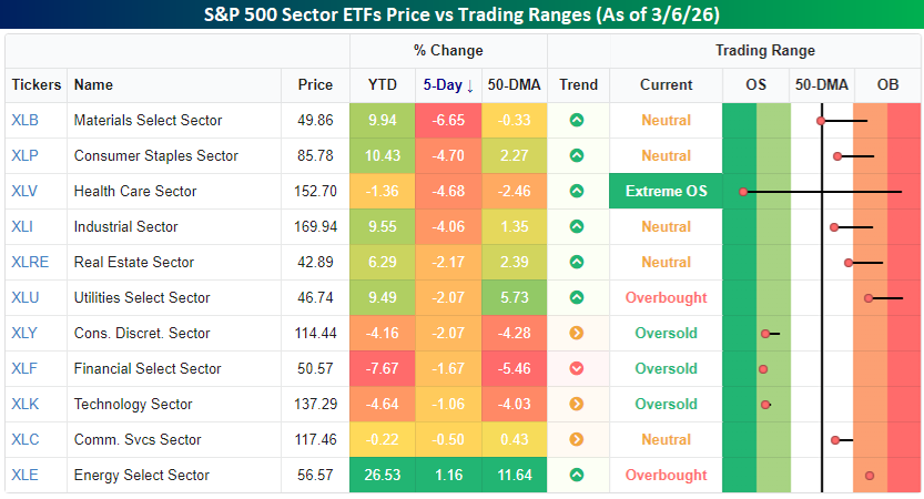 The war in Iran hasn’t had much of a benefit on any sector, except, of course, Energy. Since the fighting broke out just over a week ago, Energy has rallied over 1% while every other sector is in the red, with nine down more than 1%. Four sectors declined by over 4%, with Materials leading the losses at 6.65%, followed by Consumer Staples, Health Care, and Industrials.  Health Care’s losses have taken that sector into ‘extreme’ oversold territory after trading in ‘extreme’ overbought territory just over a week ago. War has a way of changing market conditions very quickly!