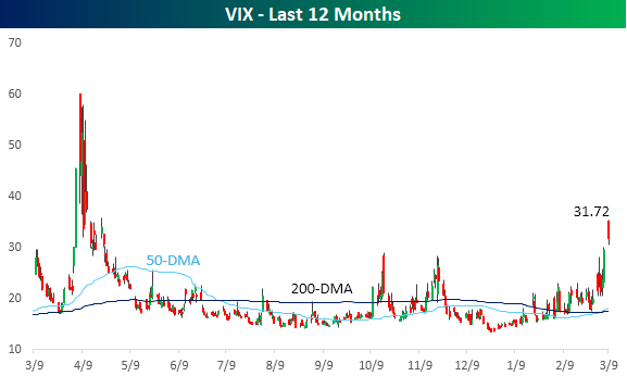 With the S&P 500 on pace to gap down 1% at the open for the fourth time in six days today, volatility has been on the rise, and the VIX is trading above 30 for the first time since last spring during the tariff-tantrum. Back then, though, the VIX briefly breached 60 before pulling back. So far during the current war, the highest the VIX has traded is 35.3. Last week may seem like a rough period for the markets, but relative to other points in just the last year, it could be a lot worse. The longer this conflict lasts and oil supplies remain disrupted, the more likely it is that conditions will worsen.