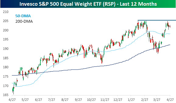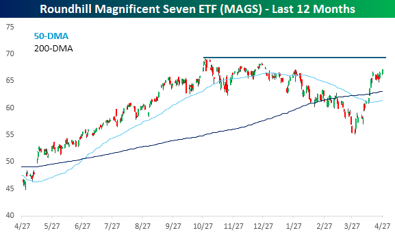 Over the last several years, whenever the market hits new highs, we look to see what’s driving the move higher. Is it the mega-caps or the rest of the index? Starting with the mega-caps, it’s been a strong month for the group, and while the group rallied nearly 1% yesterday to provide some positive momentum, it remains well below its prior all-time highs from last fall. At yesterday’s close of $67.08, the MAG7 ETF (MAGS) is still nearly 3% below its prior peak.
