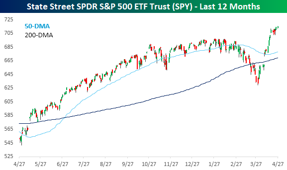 The S&P 500 hit both a new intraday and a closing high yesterday as the bull market continues to reconfirm itself with six closing record highs since 4/15. The index has had a parabolic run this month, and while a pullback or consolidation wouldn’t surprise anyone, the index should find decent support at the prior highs from late last year/early this year.