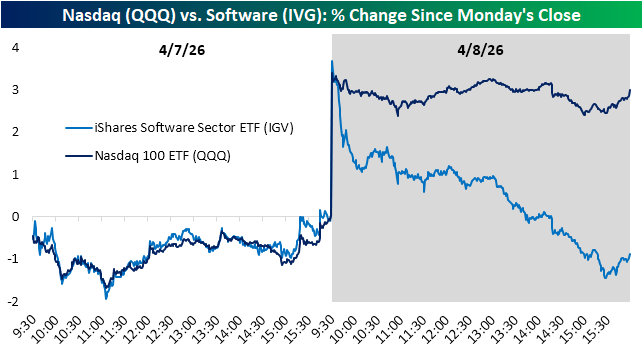 While the Semis and Transports surged and held onto gains yesterday, the same can’t be said for Software. Below is an incredible two-day intraday chart of the Nasdaq 100 ETF (QQQ) versus the iShares Software ETF (IGV). While IGV and QQQ tracked each other closely through yesterday’s sharp upside open, software (IGV) collapsed from there and ended up closing down 1% on the day, while QQQ held steady and went out with a gain of nearly 3%.