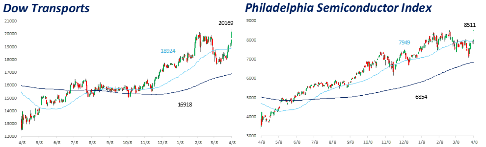 While the S&P 500 still sits 2.8% below all-time highs, both the Dow Transports and Philadelphia Semiconductor index — two groups seen as “leading” indicators — hit new all-time highs yesterday. The charts below show the breakouts to new highs for these two closely-followed areas of the market.