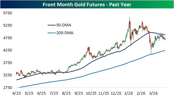 As shown below, gold peaked in late January and after successfully testing support at its 50-DMA intraday on February 2nd, it quickly moved higher to retest prior highs within the next month. That run to new highs was unsuccessful though as gold has lost its glitter. The metal closed below its 50-DMA by March 18th (the first instance since August 21, 2025) and continued lower throughout the back half of the month. Similar to the early February intraday test of the 50-DMA, on March 23rd, gold tested its 200-DMA. While it never closed below, the rally higher since then has stalled as it re-addressed the 50-DMA which is now trending lower.