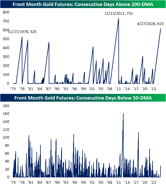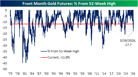 Checking in on front month gold’s drawdown, at the worst of the decline on a closing basis, gold fell 17.7% versus its January peak. As shown below, that was the sharply drawdown since late 2022, but is far from the worst declines on record. Further, the metal has rallied back to now be 11.8% from its 52-week high. That is only a few percentage points worse than the historical average drawdown (-9.9%).