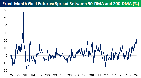 All that is to say that from a technical picture, front month gold has seen a deterioration in its technical picture as it is now sandwiched between support at the 200-DMA and 50-DMA. While those two moving averages will continue to be levels to watch, there is a wide spread between them. As shown below, there’s 16% between the two moving averages, and one month ago that spread was over 20%. The only other times this spread has been wider was 1980, 1983, 2006, and 2008.