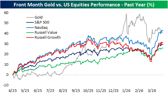 Last year, precious metals were an astoundingly strong trade with some of the strongest performance of any asset. As shown below, as the calendar turned the page, the rally in front month gold has reversed. Over the last year, gold is still handily outperforming indices like the S&P 500, Russell 1,000 Value, and Russell 1,000 Growth. However, the Nasdaq has caught the yellow metal due to a combination of Tech stock’s recent strength and the recent weakness in gold.