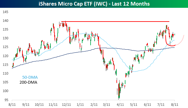 Looking at the performance of micro-caps, as measured by the iShares Microcap ETF (IWC), after testing the Q4 highs in late July, they pulled back to the 50-day moving average, where they bounced to kick off August. It’s still early, but if the bounce holds, the index could be rounding out the right side of a cup and handle formation.