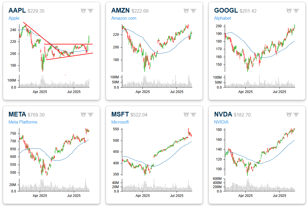 Below are six-month price charts of the mega-caps. A few months ago, pretty much all of these charts were in downtrends, but now that Apple (AAPL) has recovered and broken above resistance, all six look to be trending higher.
