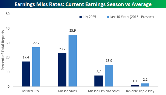 Conversely, companies are also reporting weaker-than-expected results at a much slower pace. The rate of EPS misses is nearly 10 percentage points below the historical average, while the revenue miss rate is over ten percentage points less. With fewer EPS and sales misses, the pace of reverse triple plays is also just half the pace of the average from the last ten years.