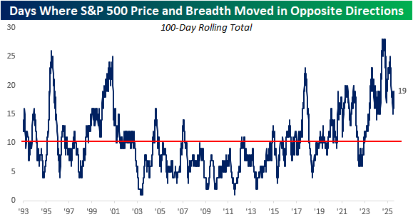 The chart below shows the rolling 100-day number of days when the S&P 500’s daily price change moved in the opposite direction as breadth. Beginning in the years right before Covid, this reading has been volatile, but the general trend has been higher. While the current level of 19 is well off the record high of 28 from last fall, right before the election, it is still nearly double the historical average of 10.