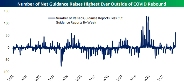 Looking for deeper insight into markets? In tonight’s Closer sent to Bespoke Institutional clients, we start by looking at the very strong pace at which companies are raising guidance (page 1) followed by a look into other details of recent earnings reports (page 2). Next, we dive into the latest sentiment findings from Schwab (pages 3 and 4). We cap off with a rundown of the latest Senior Loan Officer Outlook Survey (pages 6 and 7).