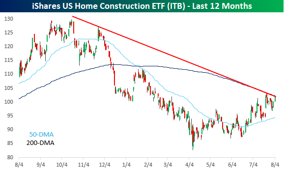 One sector that should benefit from lower yields is homebuilders. The iShares Home Construction ETF (ITB) has rallied 23% off its April lows, but it is still more than 20% off its 52-week high from last summer, so if the drop in yields was due to lower inflation, the group would presumably have plenty of room for more upside. From a technical perspective, ITB finds itself at an important juncture just below its downtrend that has been in place since last summer’s high, as well as the downward-sloping 200-day moving average. A rally in January failed at that level, but the ETF is heading into the latest test with a more established uptrend in place.