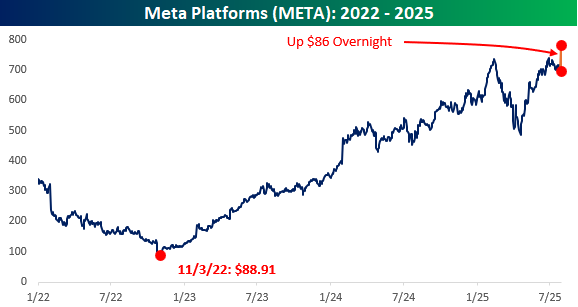 In the case of META, it’s hard to believe how far this stock has come since its bear market lows less than three years ago. Think about this for a second. At its low on 11/3/22, META closed at $88.91 per share, and earlier this morning, shares were up $86. In other words, META was up almost as much overnight as its entire share price was at the low in November 2022.