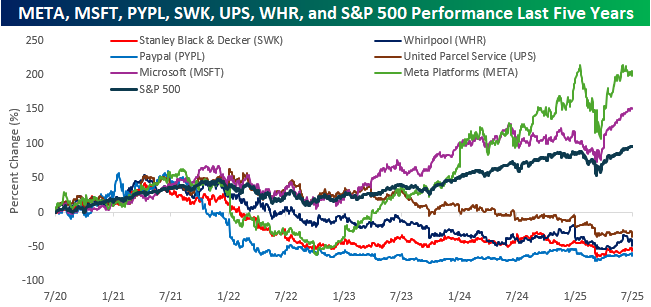 Yesterday, we mentioned that a number of commentators were pointing to negative reactions in the stocks of PayPal (PYPL), Stanley Black & Decker (SWK), United Parcel Service (UPS), and Whirlpool (WHR) as a potential red flag for the economy. We thought those concerns were misplaced, given that these stocks have been disasters in terms of their performance over the last five years. On a combined basis, they also have a market cap of just $156 billion.