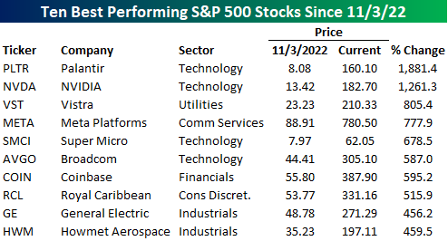 Given the massive rally in META, it’s not a big leap to conclude that it has been one of the top-performing stocks since its low in November 2022. As shown on the table below, taking early morning gains into account, the stock is up nearly 780% which is only enough to rank as the fourth-best performing stock during that time. Palantir (PLTR) tops the list with a gain of over 1,800% followed by Nvidia (NVDA) at 1,261%, and then Vistra (VST) with its gain of 805%. Even after rallying 777%, META is still underperforming a Utility stock!