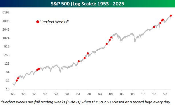Yesterday’s positive session followed what had been a ‘perfect week’ for the market, where it not only closed higher every day, but it also closed at record highs on each one of them. That doesn’t happen often. The last time there was a full week of trading, and the S&P 500 closed at a record high on all five days, was in November 2021. Since the five-day trading week in its current form started in late 1952, there have now only been sixteen perfect weeks, which are highlighted in the chart below.