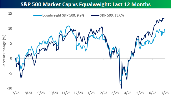 Checking up on the performance of the S&P 500 market-cap-weighted index versus the performance of the equal weight index, even after yesterday’s improvement in the equal weight index, the cap-weighted index has handily outperformed over the last year. While the performance gap between the two indices is wider now than at any point in the last year, it’s interesting to note that as recently as early May, the equal-weight index was outperforming the cap-weighted index. It just goes to show that trends can be quick to change, especially in the market.