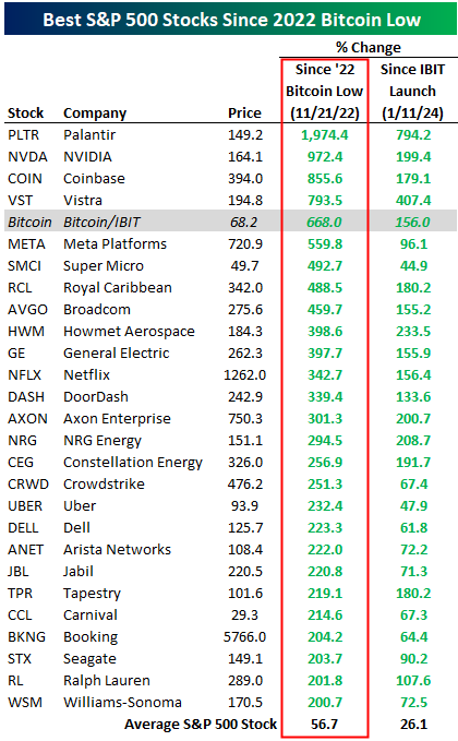 Bitcoin prices were in the mid-$10,000s back in November 2022. Since its low point during that month, Bitcoin is up 668%. We also looked to see how that gain compares to the best-performing S&P 500 stocks over the same time frame. As shown below, just four stocks in the index are up more than Bitcoin since its 2022 low: Palantir (PLTR) — up nearly 2,000%, NVIDIA (NVDA) — up nearly 1,000%, Coinbase (COIN), and Vistra (VST). Another four stocks are up more than 400% over the same time frame: Meta (META), Super Micro (SMCI), Royal Caribbean (RCL), and Broadcom (AVGO).