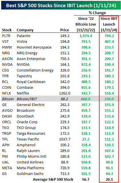 Compared to current S&P 500 stocks, IBIT’s gain of 156% since it launched on 1/11/24 would rank 12th in terms of performance. There are eleven stocks in the index up even more than that, led by Palantir’s (PLTR) gain of 794%. Other big winners since IBIT launched include Vistra (VST), Howmet Aerospace (HWM), Axon (AXON), NVIDIA (NVDA), Tapestry (TPR), Royal Caribbean (RCL), Coinbase (COIN), and Netflix (NFLX). There are 21 stocks in the S&P up more than 100% since IBIT’s launch in early 2024, while the average stock in the index is up 26.1%.