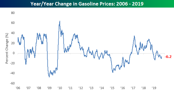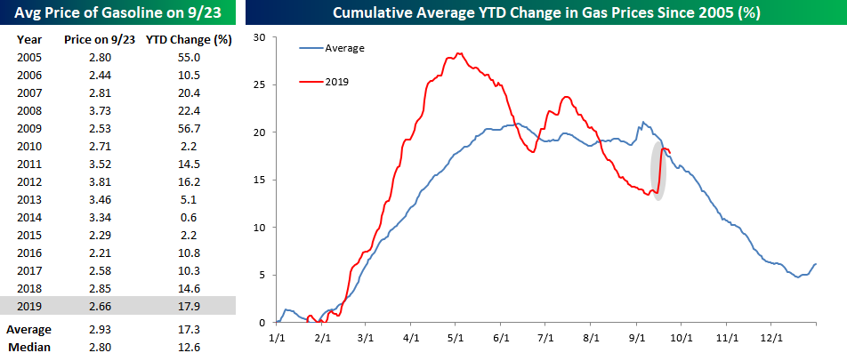 While last week’s surge in oil prices after the attacks on Saudi Arabian oil facilities stoked concerns of a spike higher in gas prices, the rally has already started to fizzle out. As of yesterday, the national average price of a gallon of gas was $2.66, and while that’s ten cents higher than where prices were before the attacks, we’ve already started to see prices ease for three days in a row now. With a YTD gain of 17.9%, this year’s move has now been slightly above the historical average (17.3%) dating back to 2005 and well above the median of 12.6%.