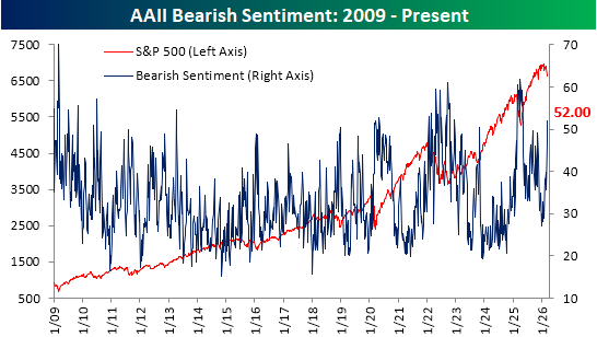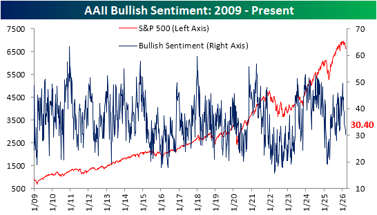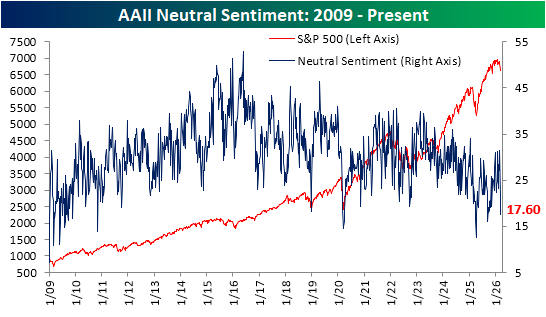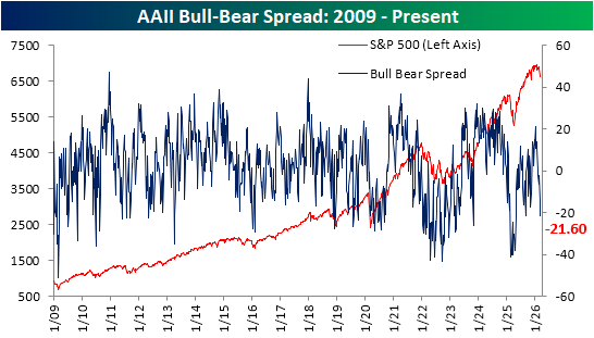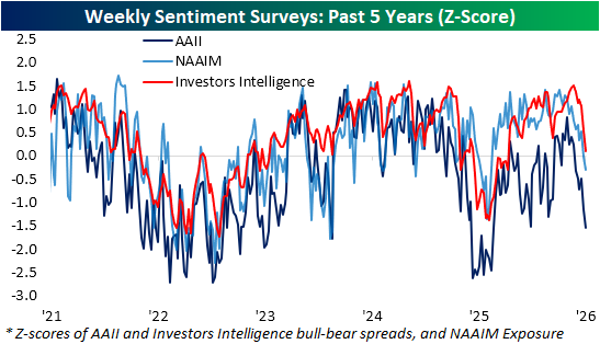 We would also note that not only has there been a big move toward bearish sentiment due to lost bullishness, but a big drop in those reporting neutral sentiment has also been a factor. Only two weeks ago, 31.4% of respondents reported neutral sentiment for the highest reading since January 2025. In the two weeks since then, it has fallen to 17.%, which ranks in the 4th percentile of all periods on record, and is the lowest since a reading of 16% last September.
