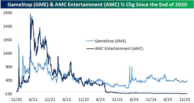 It has now been five years since the height of meme-stock mania. In January 2021, there was a surge in buying of crypto and NFTs, but perhaps the most in-vogue assets at the time were extremely high short interest names like GameStop (GME) and AMC Entertainment (AMC). These two stocks experienced enormous short squeezes led by the Reddit message board r/wallstreetbets. Remember Roaring Kitty?