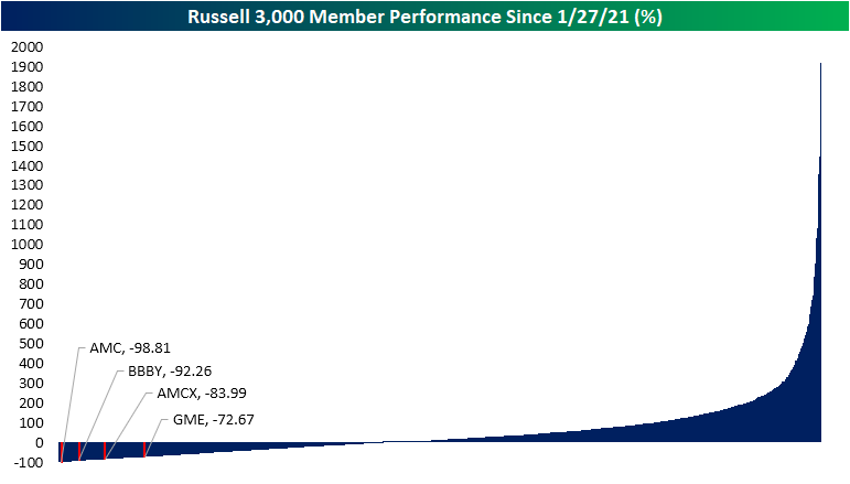 In the chart below, we show the individual performance of Russell 3,000 stocks since the peak of meme-stock mania on 1/27/21. Some of the most notorious meme stocks in early 2021 like AMC, BBBY, and GME are among the index’s worst performers since then. While opportunities for short squeezes may always be present, sometimes heavily shorted names are being bet against for good reason.