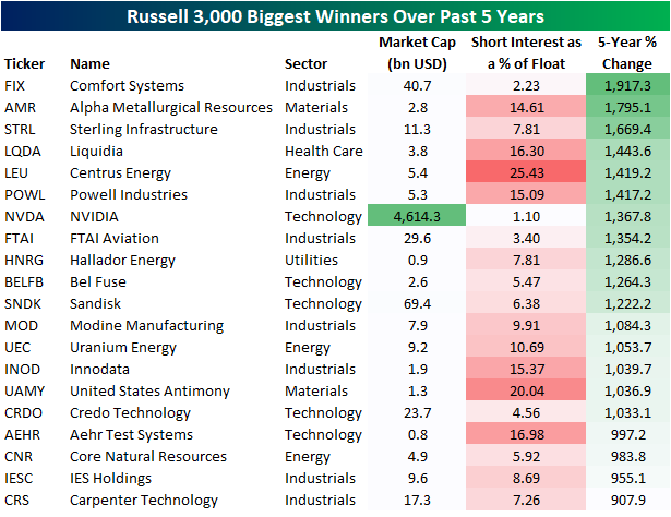 So which stocks have been the biggest winners in the five years since the peak of meme-stock mania? As you might expect, the emergence of AI means that among the biggest winners are AI headliners such as NVIDIA (NVDA), Comfort Systems (FIX), and Sandisk (SNDK); all up more than 1,000%.