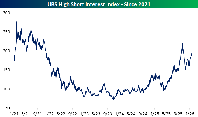 The index below from UBS tracks the 100 most highly shorted stocks with market caps above $1 billion and includes a monthly rebalancing. After shooting higher in January 2021, these stocks fell hard in the back half of 2021 and then plunged during the bear market of 2022. With that said, the index bottomed in late 2023 and has been on its way upwards ever since.
