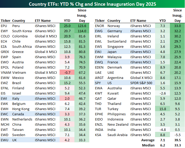 Along with strong outperformance versus US equities so far this year, country ETFs have outdone the US since Inauguration Day a little over a year ago as well. The 40+ country ETFs shown are up an average of 39.5% since President Trump’s 2nd term officially began last January, with Peru (EPU) and South Korea (EWY) leading the way with gains of 110%+. Colombia (COLO), Chile (ECH), South Africa (EZA), and Greece (GREK) rank 3rd through 6th with gains of just over 80%, while Spain (EWP), Austria (EWO), Poland (EPOL), and Vietnam (VNAM) round out the top ten.