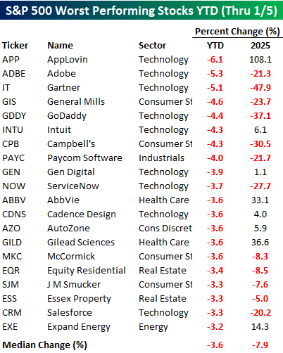 While eight of the 20 best-performing stocks in the S&P 500 so far this year are from the Technology sector, nine of the worst performers are also from the S&P 500’s largest sector. Besides AppLovin (APP), though, none of them were big winners in 2025. Of the 20 worst performers in the first two trading days of 2026, twelve were also down in 2025, and the median decline of all 20 was 7.9%. It’s also worth pointing out that the magnitude of the declines in the biggest losers so far this year is basically a third of the magnitude of the size of the gain in the biggest winners (-3.6% vs 10.6%).