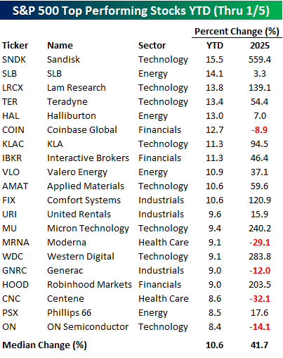 The market is always changing, but just because the year on the calendar changed last week, the performance of stocks leading the way higher hasn’t changed all that much- at least not yet. The table below lists the 20 best-performing S&P 500 stocks so far this year. For starters, Sandisk (SNDK) is the best-performing stock this year, and it was also the best in the S&P 500 last year, even though it didn’t have a full year of trading to gain more than 500%!