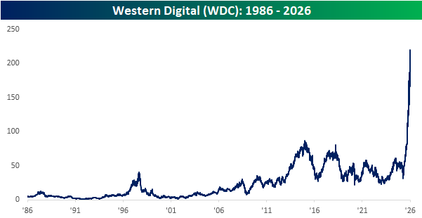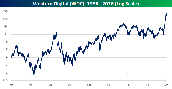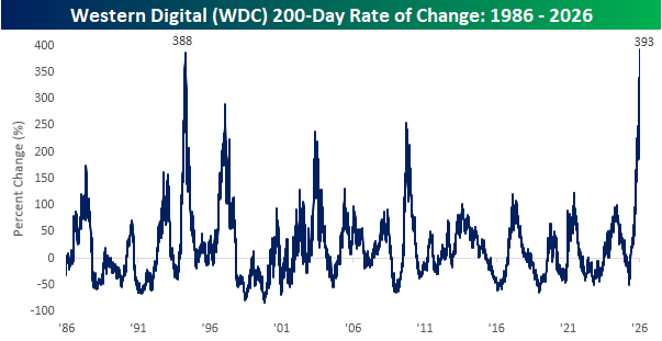 The next chart is perhaps the most incredible regarding WDC’s recent rally. Through yesterday’s close, WDC’s share price rallied 393%, which was up from a 200-day move of 318% the day before. With that move, the stock’s rally over the last 200-days is larger than any other 200-day rally since at least 1986. That’s over 40 years!