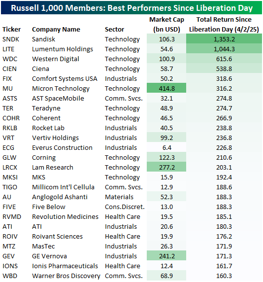 Moving back to look at the US, in the tables below we show the Russell 1,000 members that have provided the best and worst total returns over the past year. For the biggest winners, we have two 10-baggers in memory chip maker Sandisk (SNDK) and optical and photonic product maker Lumentum (LITE). SNDK is by far the biggest winner even of those two, up 1,353%. Not far behind SNDK and LITE are two more AI Infrastructure stocks: Western Digital (WDC) and Ciena (CIEN). Many of these top performing stocks are plays on AI buildouts, however, there are some other stocks from other parts of the market such as Warner Bros Discovery (WBD), GE Veranova (GEV), and Five Below (FIVE).