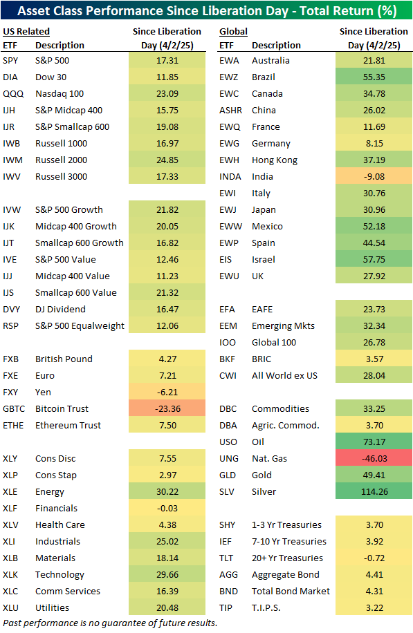 Below we show our asset class performance matrix with total returns for a range of ETFs since liberation day.