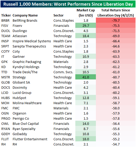 Turning over to the other end of the spectrum, the Russell 1,000 currently has 36 members that are down over 50% in the past year. Of those, the biggest loser is nutrition company BellRing Brands (BRBR), which has fallen close to 80%. Fintech firm Fiserv (FISV) and language learning company Duolingo (DUOL) are the only others down more than 70%.