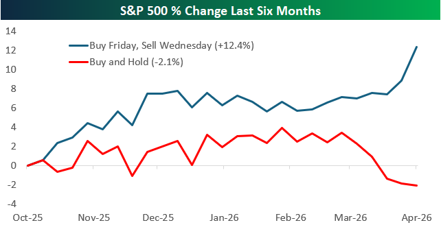 Hypothetically, had you only owned the S&P 500 through the first three days of the week over the last six months (buy at the close on Friday and sell at the close on Wednesday), you’d be sitting on a nice 12.4% gain right now versus a decline of 2.1% for buy and hold.