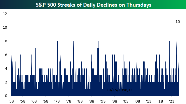 The S&P 500 is currently on pace to close lower for the 10th consecutive Thursday, which would be a record Thursday losing streak going back to 1953 (when the current five-day trading week was put in place by the NYSE).