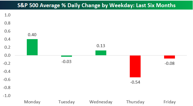 Over the last six months, the S&P 500 has averaged a decline of 0.54% on Thursdays, which is by far the worst of any weekday. As shown below, Friday is the only other weekday that has averaged a decline (-0.08%), while each of the first three trading days of the week have actually averaged gains.
