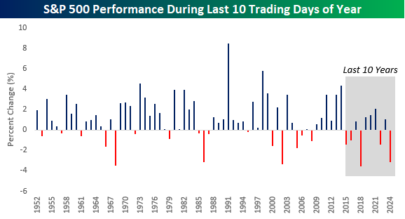 The chart below shows the S&P 500’s performance in the last ten trading days of the year for every year since 1952 (when the five-day trading week in its current form started). Just looking at the chart, it’s easy to see that positive ends to the year outnumber negative ones. It’s also much more common to have a solid gain to end the year than a sharply negative one. While there have only been five years when the S&P 500 declined 3%+ in the last ten trading days of the year, there have been thirteen when it rallied more than 3%, including gains of 8.5% and 5.8% in 1991 and 1998, respectively.