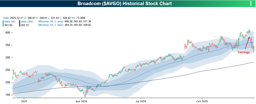 Then, last week, Broadcom (AVGO) reported another triple play, but that wasn’t enough to provide any positive traction in the stock. On 12/12, AVGO gapped down over 5% and is down close to another 15% since that opening trade.