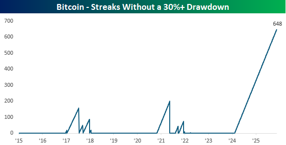 What’s notable about the recent decline is that, over the weekend, Bitcoin ended a streak of 219 days without trading in a 25% drawdown. That was the longest streak since at least 2015.
