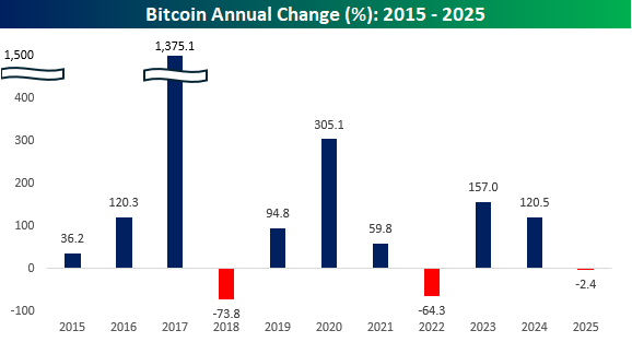 More notable about the recent weakness is that prices are now on pace for just the third down year since 2015. It’s been a painful six weeks, but if there’s any consolation, “HODLers” can take some comfort that this year’s decline is nowhere nearly as steep as the 64.3% decline in 2022 and the 73.8% decline in 2018.