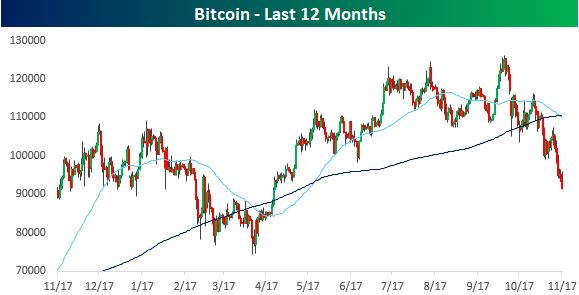 What people are willing to pay for Bitcoin today is a lot lower now than it was six weeks ago. After hitting record highs in early October, Bitcoin prices have been in free-fall, dropping more than 27% from their highs and to their lowest level since the tariff-tantrum in April. From a technical perspective, the 50-DMA has now crossed down through the 200-DMA, indicating a shift in the trend for crypto.